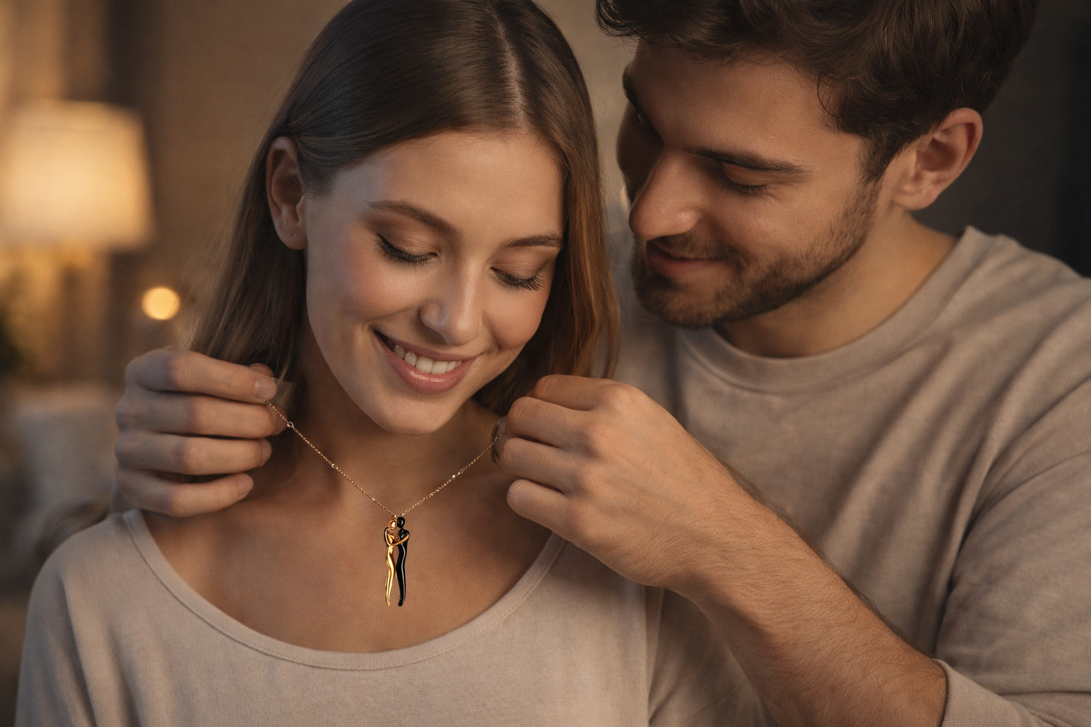 Two figures wrapped together in one simple pendant. It’s subtle, meaningful, and instantly recognizable without being over-the-top.